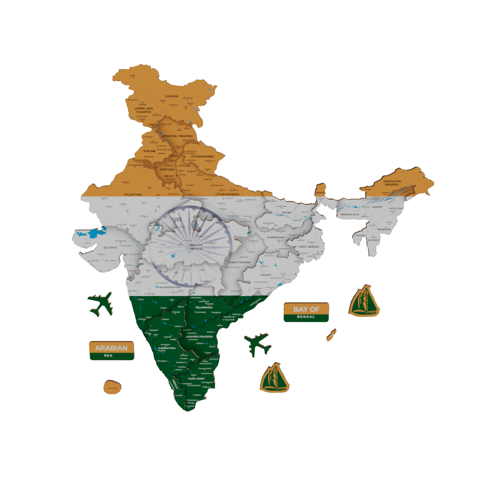 Expertly crafted with a 3D wooden design, the Tricolor showcases the intricate borders and regions of India. Enhance your decor with this unique map, providing a visual representation of the country while adding a touch of sophistication to any space.